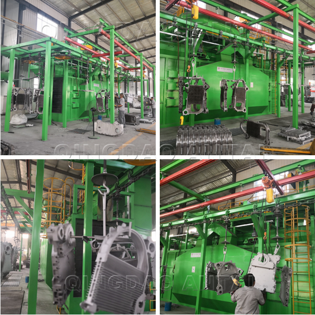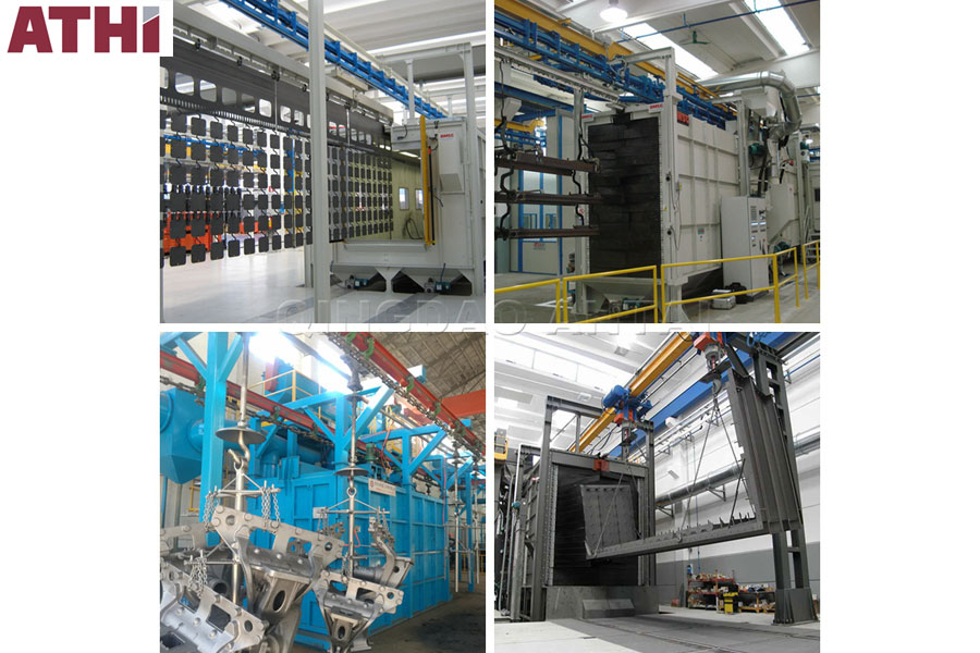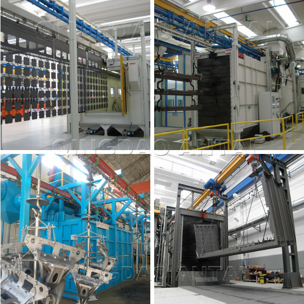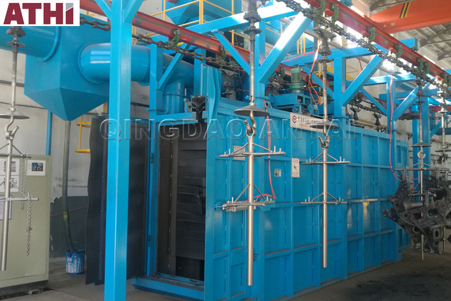 【工艺】:工件随吊链可连续运行、步进运行或积放推式输送,使工件在装卸区和抛丸区分别处于停止状态,实现定点装卸和定点抛丸,生产率高,运行可靠。